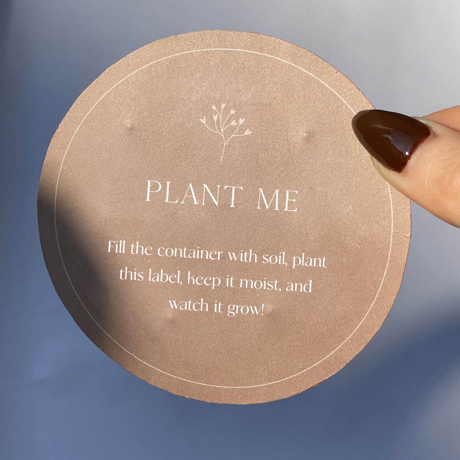 Our labels embedded with Mimosa Pudica’s seeds. Famously known as the Sensitive Plant, the Mimosa pudica has long been an object of wonder and curiosity because its leaves are highly responsive to touch, folding inwards when triggered. When the candle burns out, fill the empty container with soil. Place the seed label and lightly cover with 1/2 inch of soil. Keep it moist until germination. This plant likes bright light and high humidity. Keeping it moist but not soggy is key. Also, ensure that it is planted in well-draining, loamy soil. The Sensitive Plant is completely non-toxic. This means that you can safely keep it around pets and babies.